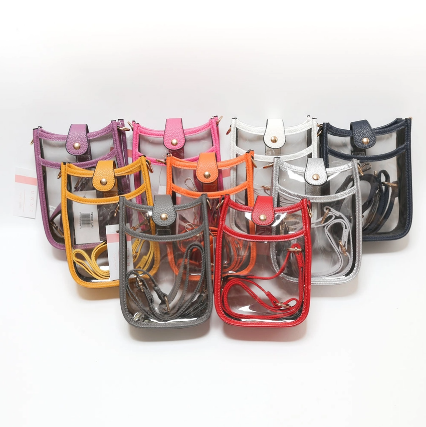Compact transparent crossbody bag with faux leather trim and adjustable wide strap. Stadium-approved design ideal for concerts, festivals, and sporting events. Secure snap closure and stylish silhouette.