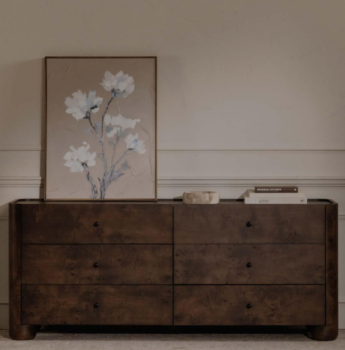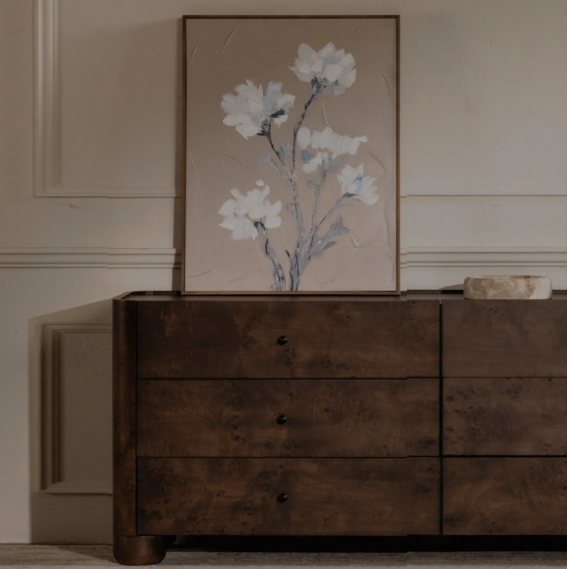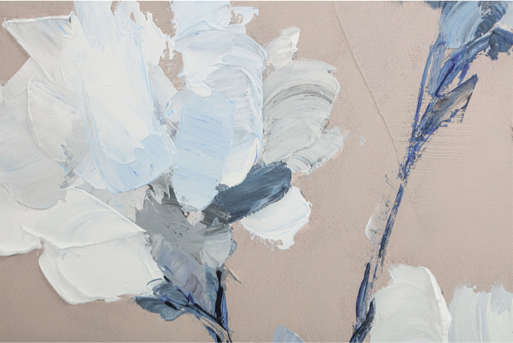 A compelling bloom unfolds in the Caspia framed painting. Thoughtful layers of acrylic paint reveal an abstract floral form punctuated by a striking blue stem. The minimal neutral background evokes organic charm, while a the warm toned frame promotes transitional style.