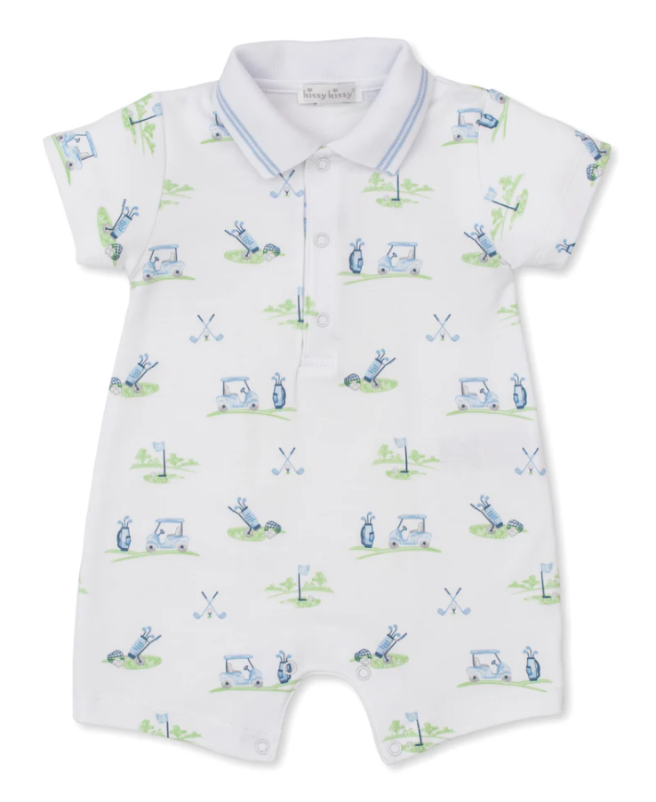 A fun golf theme patterns this cozy playsuit for your baby featuring a collar and snap closure. Made from the softest Pima cotton for ultimate comfort.