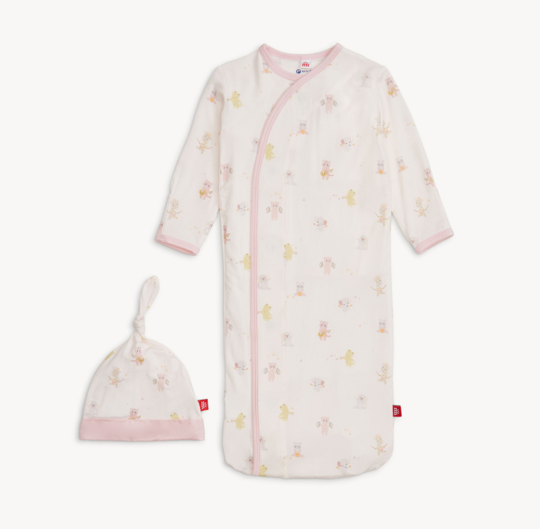 The modal Open Bottom Gown & Hat Set is a newborn, late-night must-have with magnets and an elasticized bottom that take diaper changes to a new level of fuss-free efficiency. It strikes the perfect balance between a swaddle and a sleep sack, making it ideal for car rides as well. Eco-friendly modal is silky soft, stretchy, and breathable for a better night's sleep.