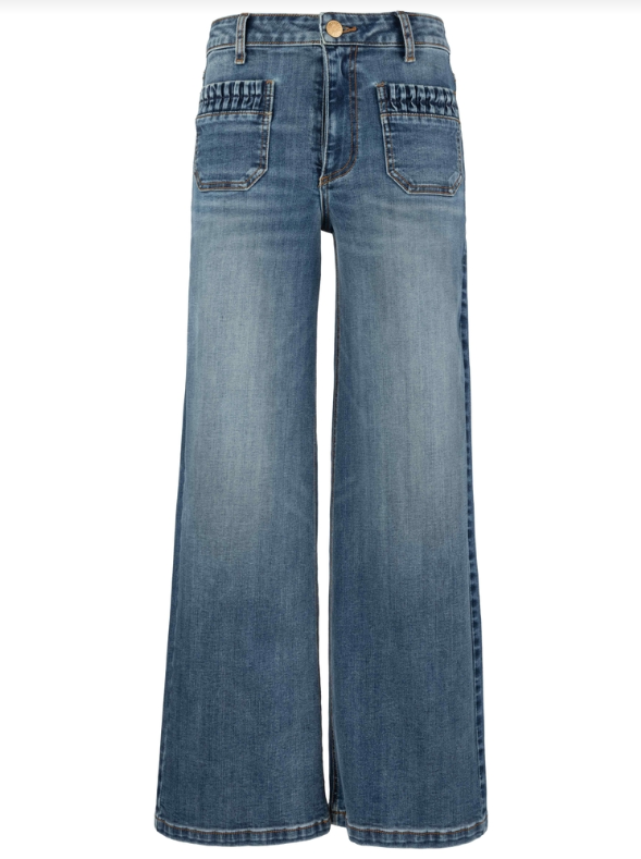Elevate your casual wardrobe with these high-rise, wide-leg jeans in a versatile medium wash. Designed for ultimate comfort, they are very stretchy, making them perfect for all-day wear. Patch pockets with ruched detailing add a unique, modern touch to a classic silhouette. Effortlessly stylish and flattering, these jeans are a must-have for your everyday rotation.