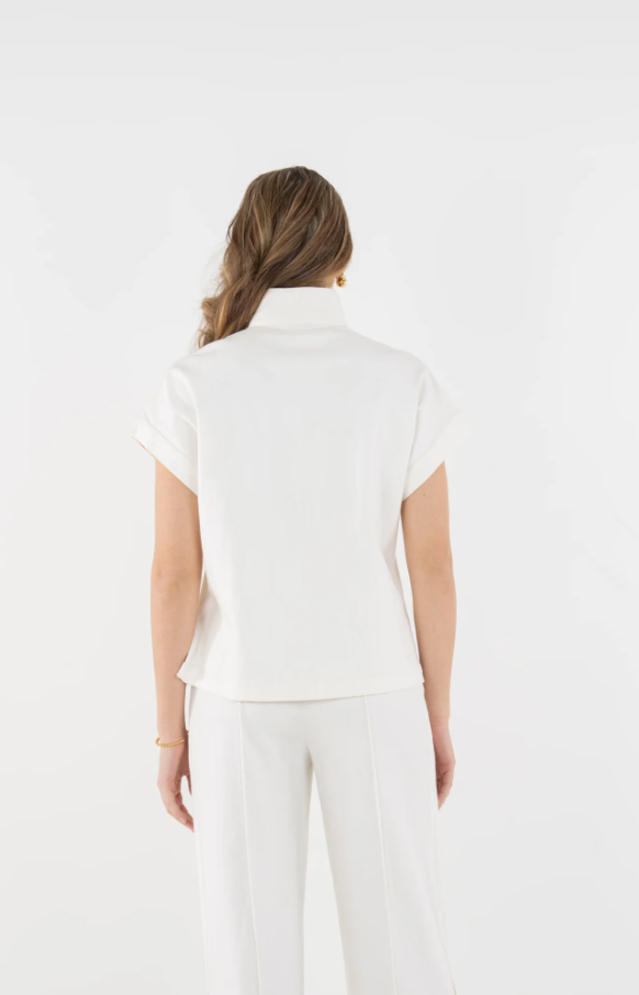 The Poppy Pullover in Gardenia Denim is a refined essential designed for effortless everyday wear. Cut in a relaxed yet slightly tailored silhouette, this style features short dolman sleeves and a 3/4 zip neckline finished with our signature logo pull for a subtle, sporty detail. Crafted in a fabric with easy structure and a substantial hand feel, this pullover offers polished comfort with a modern edge. Versatile and timeless, it is a go-to piece that moves seamlessly from casual moments to on-the-go days with ease.