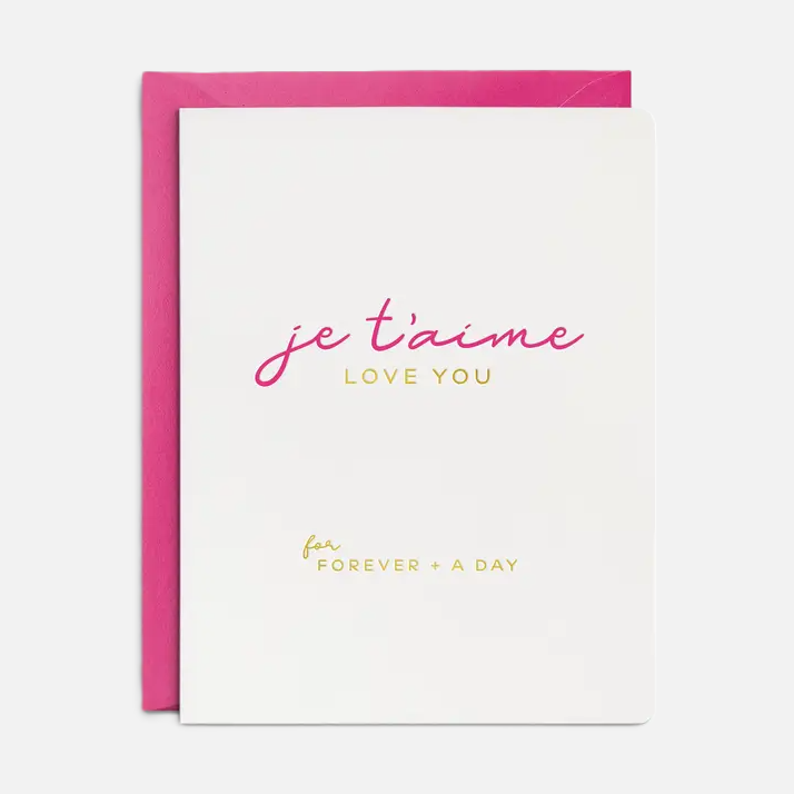 Je T'aime card is printed with two color letterpress on luxe heavyweight cardstock. Magenta and light pink letterpress on ivory paper.  We print all greeting cards at our in-house print shop on traditional letterpress machinery. Folded card with blank interior and envelope.