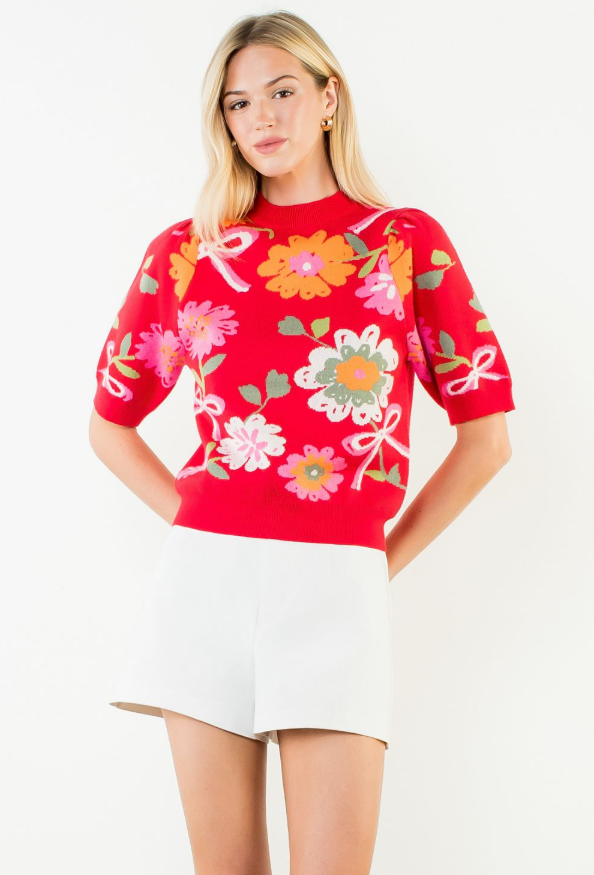 Floral Detail Knit Short Sleeve Top - 13 Hub Lane   |  Crewneck Sweaters