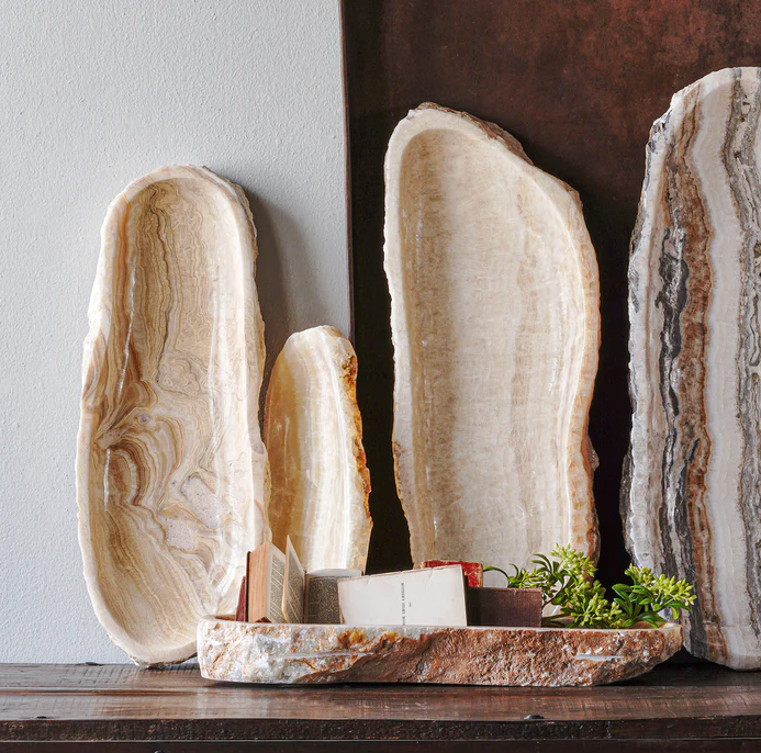 Hand-crafted from a thick slab of stone, the Onyx Tray Long is roughly rectangular with curved ends. The Onyx Tray Long has a subtly curved inset that is polished to provide a juxtaposition to the rough finish of the sides. The Trays are carved so that the variegated striped hues of the stone run longways. The Onyx Tray Long features slight irregularities in shape that make each distinctly beautiful.