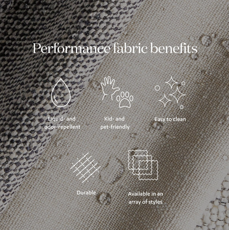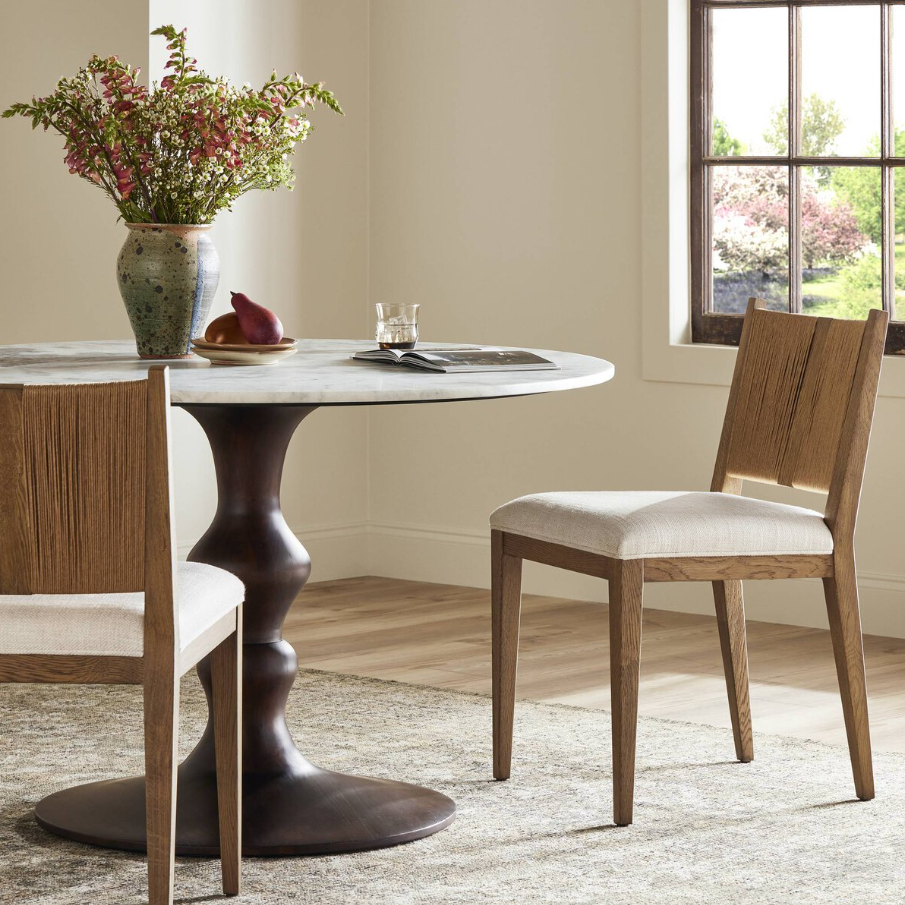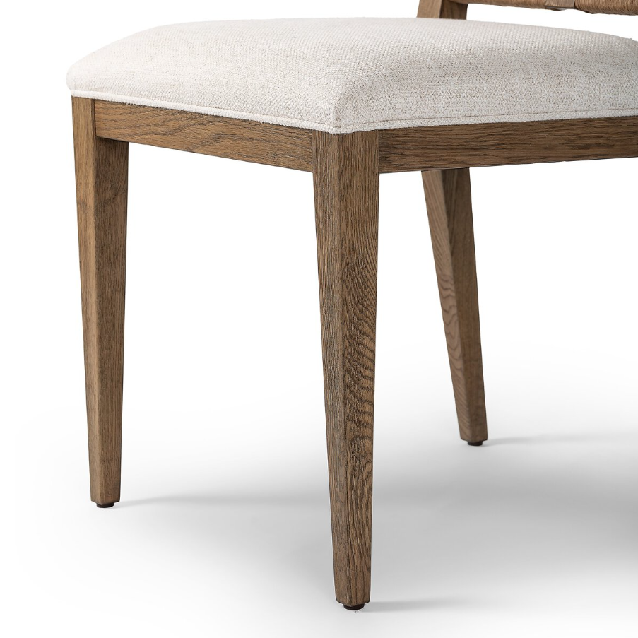 Unique materials make the chair. A perfectly pitched backrest is made from wrapped paper cord and aged oak, for a natural, tetxured look. Simple squared seating is upholstered in high-performance fabric for everyday dining. Performance fabrics are specially created to withstand spills, stains, high traffic and wear, ensuring long-term comfort and unmatched durability.