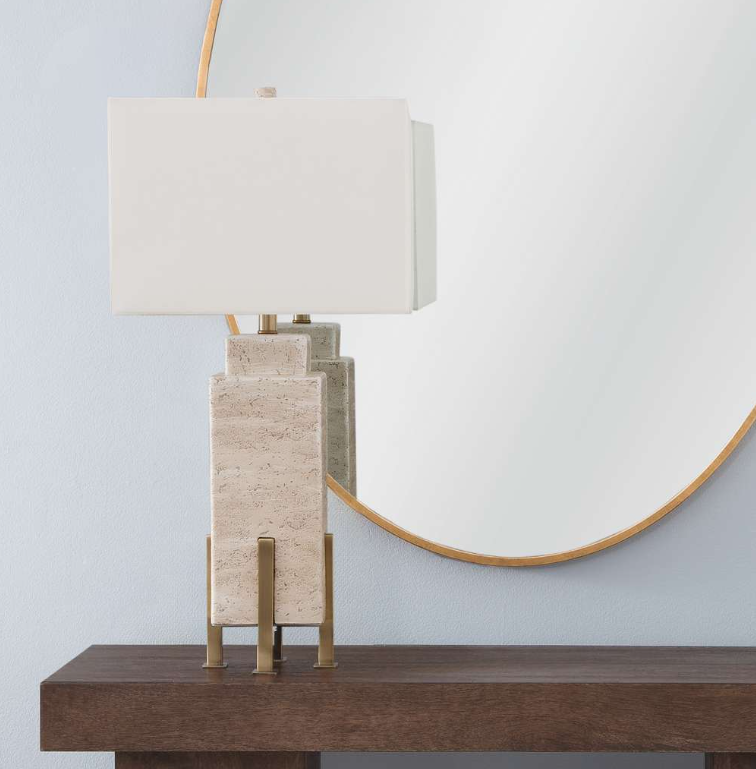 The Iris Table Lamp features an elegant, rectangular body crafted from travertine, lending a natural and textured appeal to its design. The earth-toned stone base is complemented by sleek metallic accents and topped with a classic white lampshade, creating a balance between rustic charm and contemporary sophistication. This lamp's use of natural materials and neutral palette ensures it can blend seamlessly into a variety of decor styles while adding a touch of understated luxury.