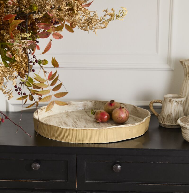 Bring the beauty of nature to the dining table with the Sycamore Tray, featuring a beautiful bark inspired texture and finish around the rim and interior. This artisinal serving tray can be used for hor'deurves, or for displaying a collection of harvest decorative styles. The circular tray has raised sides with carved vertical lines all around the exterior. Serve family style dishes at the table alongside the rest of the Sycamore Collection.
