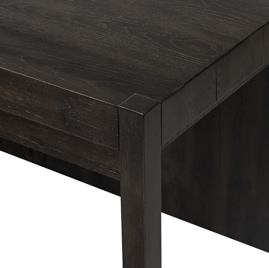 Made from solid oak and oak veneer and finished in a smoky black, an executive-size desk features a fully finished back, offering the option to float-style in a room. Plenty of varied-size drawers offer generous storage space.