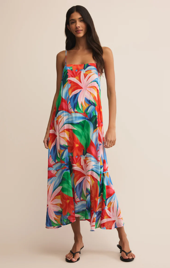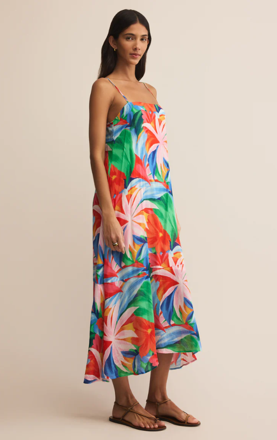 With its vibrant tropical floral print and fully lined silhouette, this flowy maxi dress brings vacation energy to everyday wear. Adjustable tie-back spaghetti straps and a square neckline top off a fitted bodice that flares into a sweeping skirt.