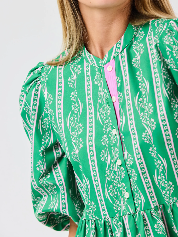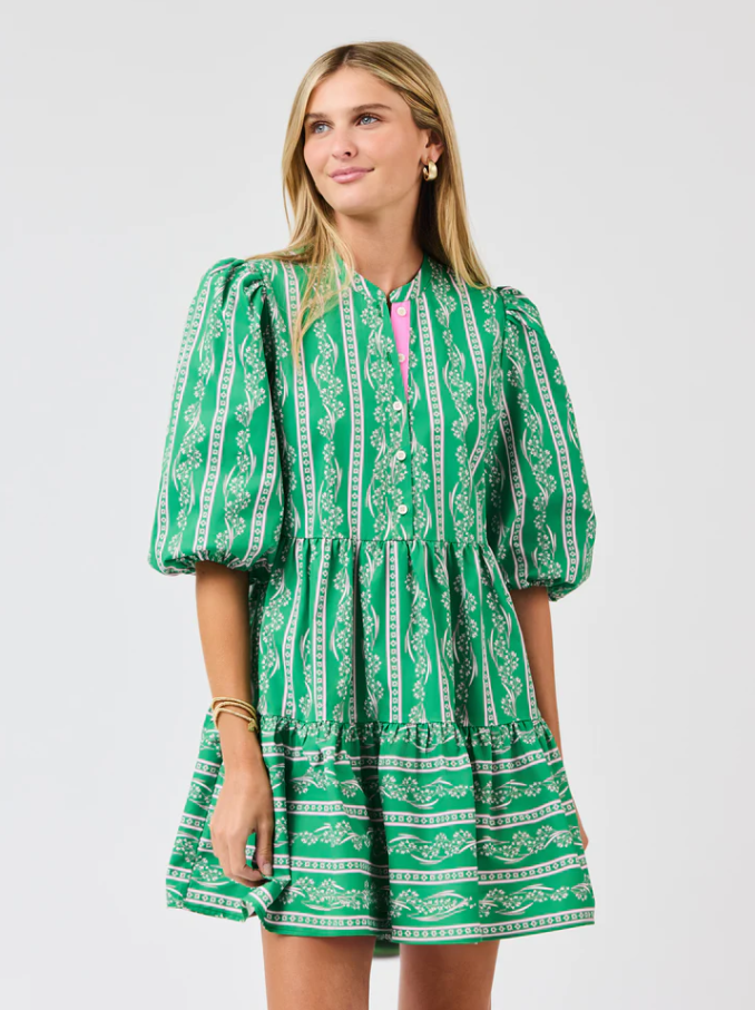 Meet the Riley Mini Dress: easygoing, charming, and ready for anything. Designed with comfy 3/4 sleeves finished with elastic and contrast grosgrain trim along the button placket, it’s all about thoughtful details. The tiered mini skirt adds soft movement and shape, while side pockets keep things effortlessly practical. A feel-good favorite you’ll reach for on repeat.