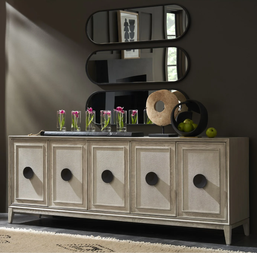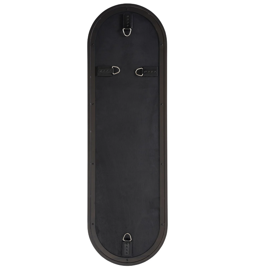 A sleek, oval silhouette framed in a dark slate metal, the Olsen Mirror captures the essence of transitional design, merging a modern aesthetic with classical elegance.