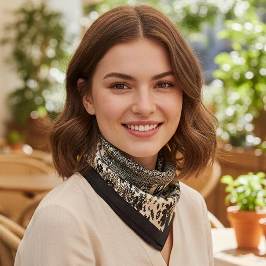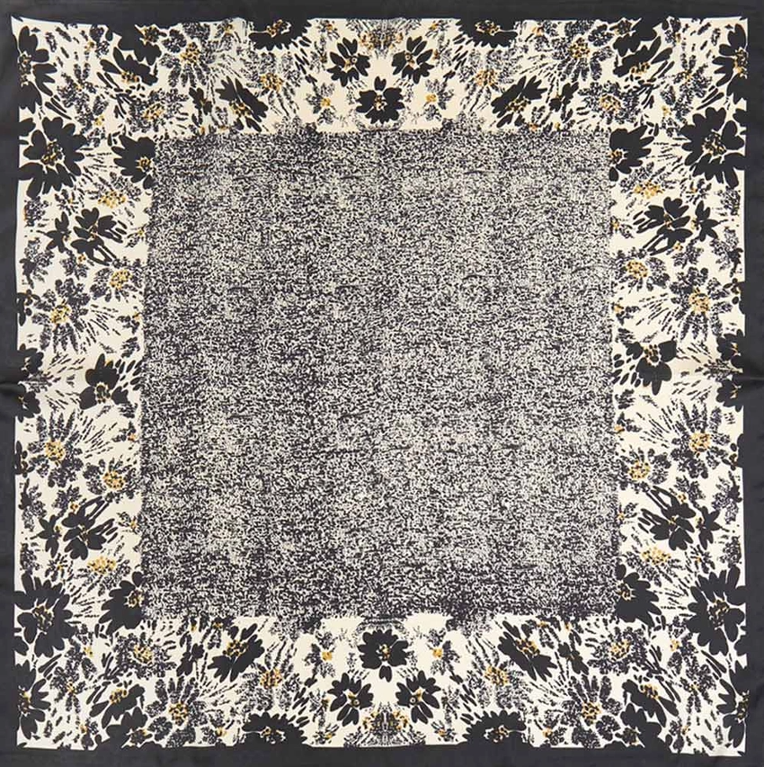 Elevate everyday looks with this floral border print square scarf, featuring a detailed botanical pattern that blends modern style with timeless elegance. Its soft drape makes it perfect for styling as a neck scarf, hair accessory, or tied on a handbag. A versatile fashion accent ideal for workwear, weekend outfits, gifting, and travel-ready accessorizing.