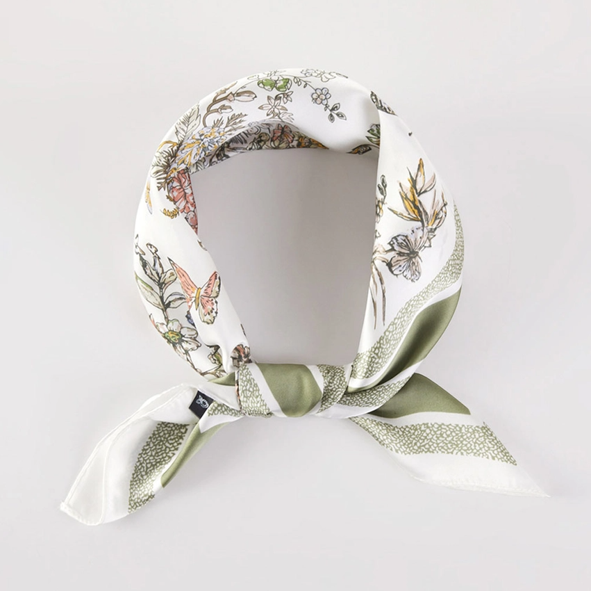 Float into style with this exquisite square scarf, featuring a dense, beautiful print reminiscent of Chinoiserie or toile designs. The pattern is filled with delicate butterflies and lush, detailed floral bouquets primarily in beautiful shades of blue and white, framed by a striped border. Made from a smooth, satin-feel fabric, this elegant accessory adds a layer of intricate beauty and sophistication to any look.