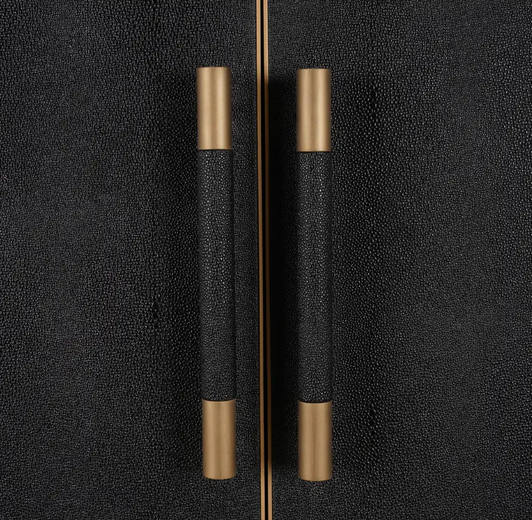 Materials: Shagreen Patterned Polyurethane, Solid Black Oak Frame, Brass Legs, PU, Tempered Glass