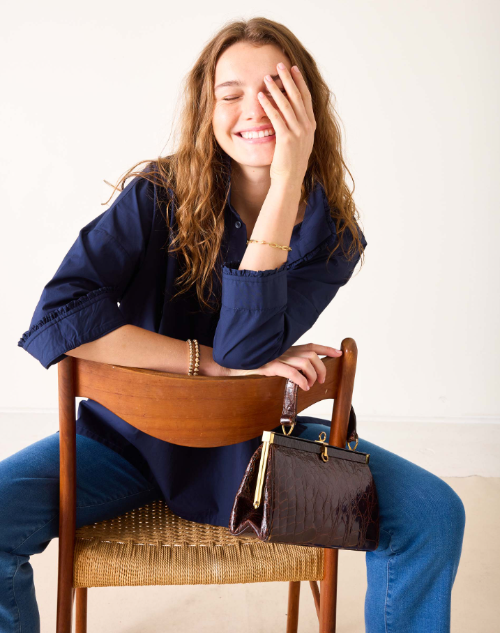 A popped collar instantly makes any outfit sophisticated and chic—even if you just paired it with your favorite jeans. Now offered with a delicate ruffle at the collar and sleeve for a feminine touch, the Emerson Top is known for its signature pop-up collar and Henley placket with hidden buttons. This intentionally oversized, ultra-soft style has a swing that makes anything you do look effortlessly smooth. If you’re looking for one piece to dress up anything—it’s time you met your very own Emerson.