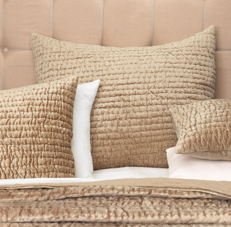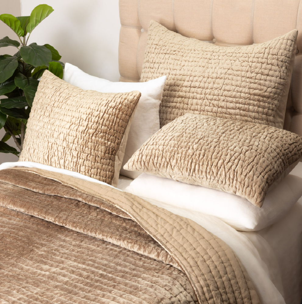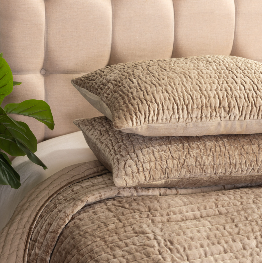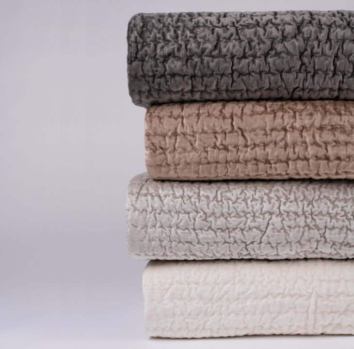 A perfect pairing of refinement and artisanal influence converge in the Baldwin quilt as lustrous rayon velvet is hand quilted with an exaggerated kantha style stitch. The result is a subtle rippling which allows the light to dance beautifully as the fabric naturally puckers with each stitch.