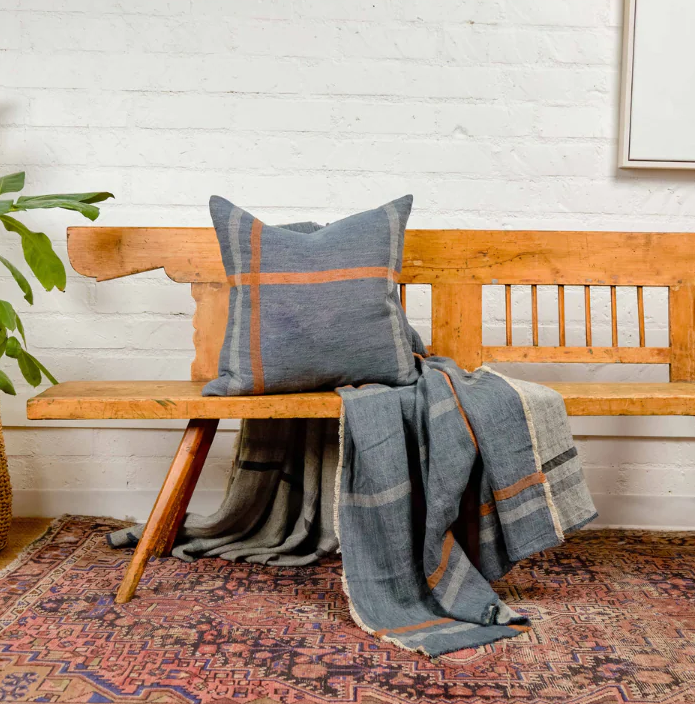 Our new Burke throw combines a gorgeous pale herringbone weave with lively stripes of darker flax, orange, yellow and light blue. Each edge is finished with a cozy fray, adding to the soft comfort of Burke’s linen fabrication.