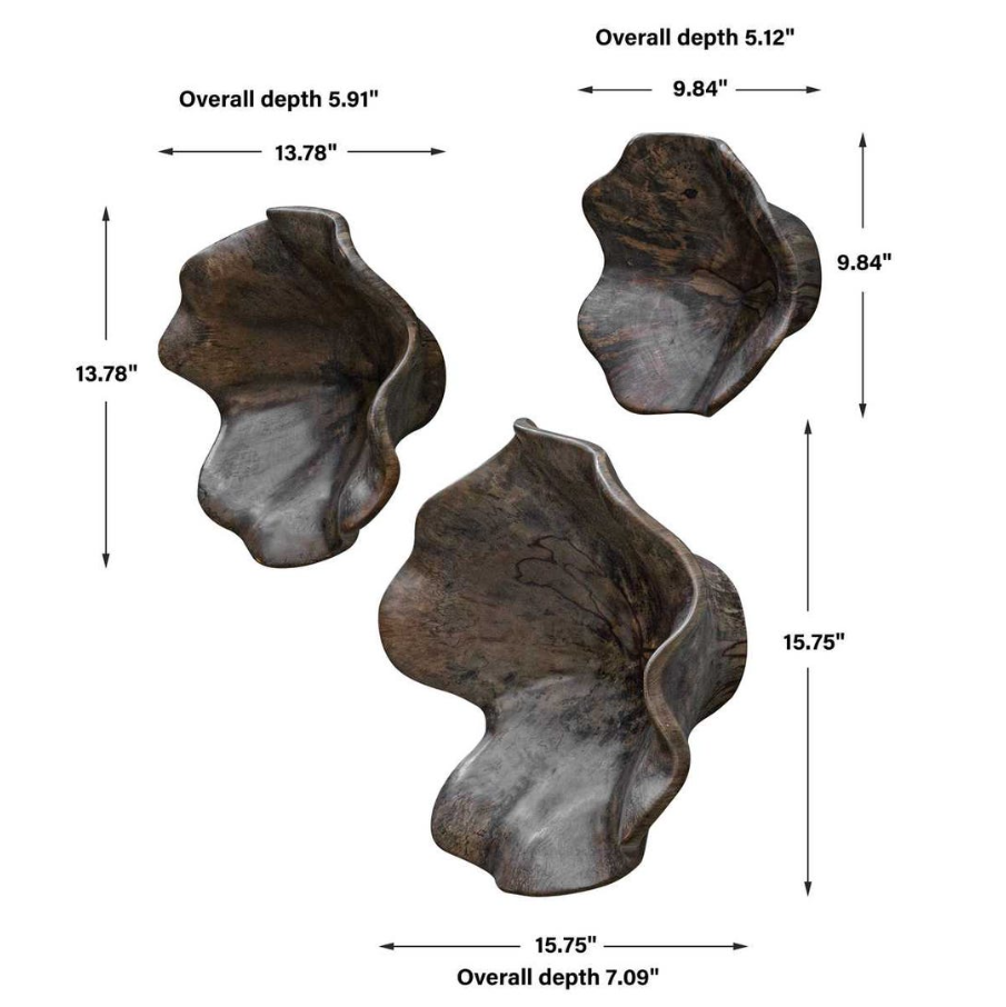 This set of three wood wall art features naturally spalted tamarind wood, finished in a rich mocha brown. Because each is individually handcrafted, sizes may vary. Cracks and variations in the grain are natural to this type of wood. May be hung on a wall with keyhole hangers, or displayed as tabletop accessories.