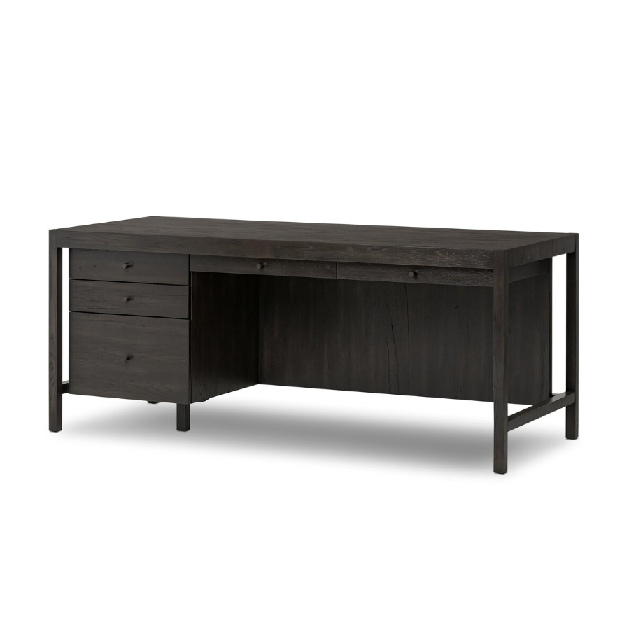 Made from solid oak and oak veneer and finished in a smoky black, an executive-size desk features a fully finished back, offering the option to float-style in a room. Plenty of varied-size drawers offer generous storage space.