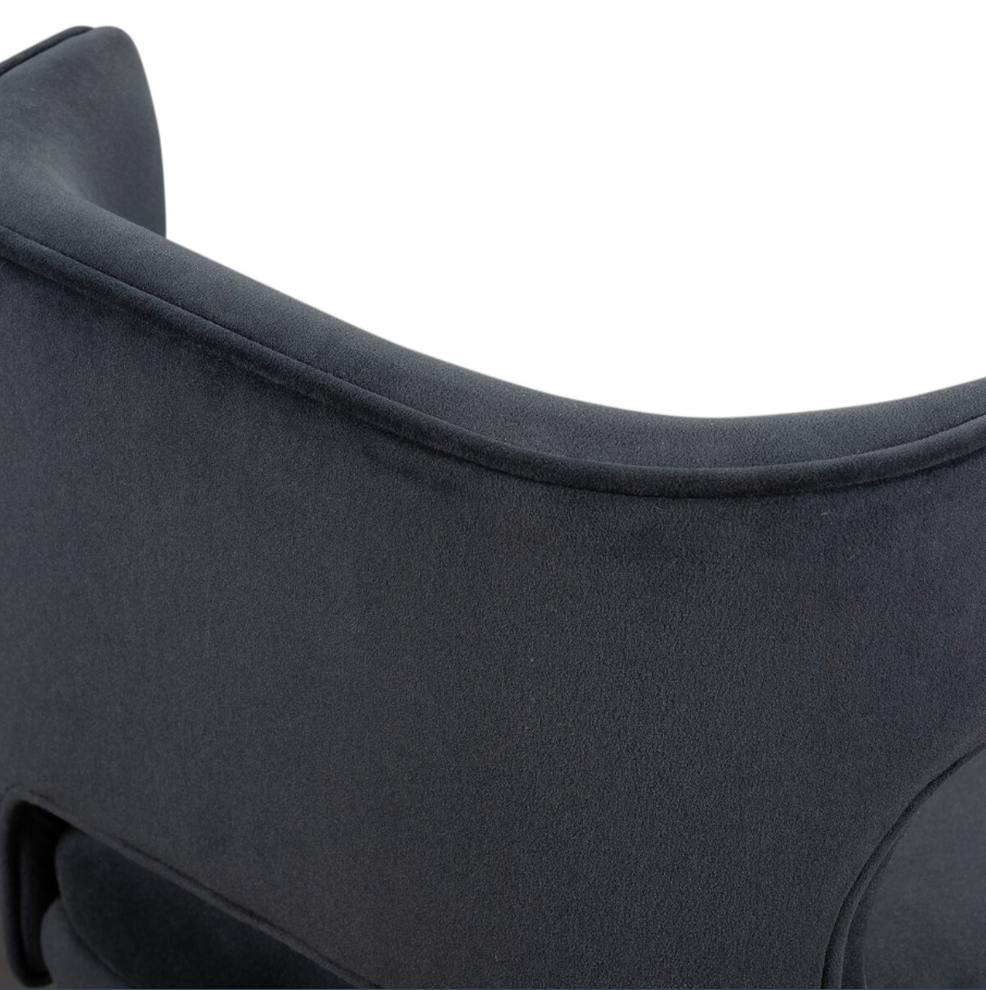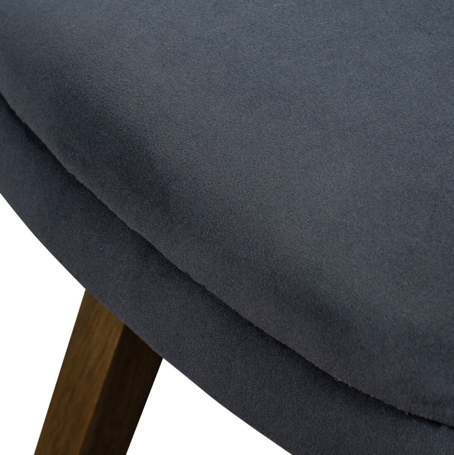 Shapely seating upholstered in deep navy velvet tops splayed parawood legs, while its modern wing shape brings contemporary presence to the table. Memory swivel adds ease and comfort.