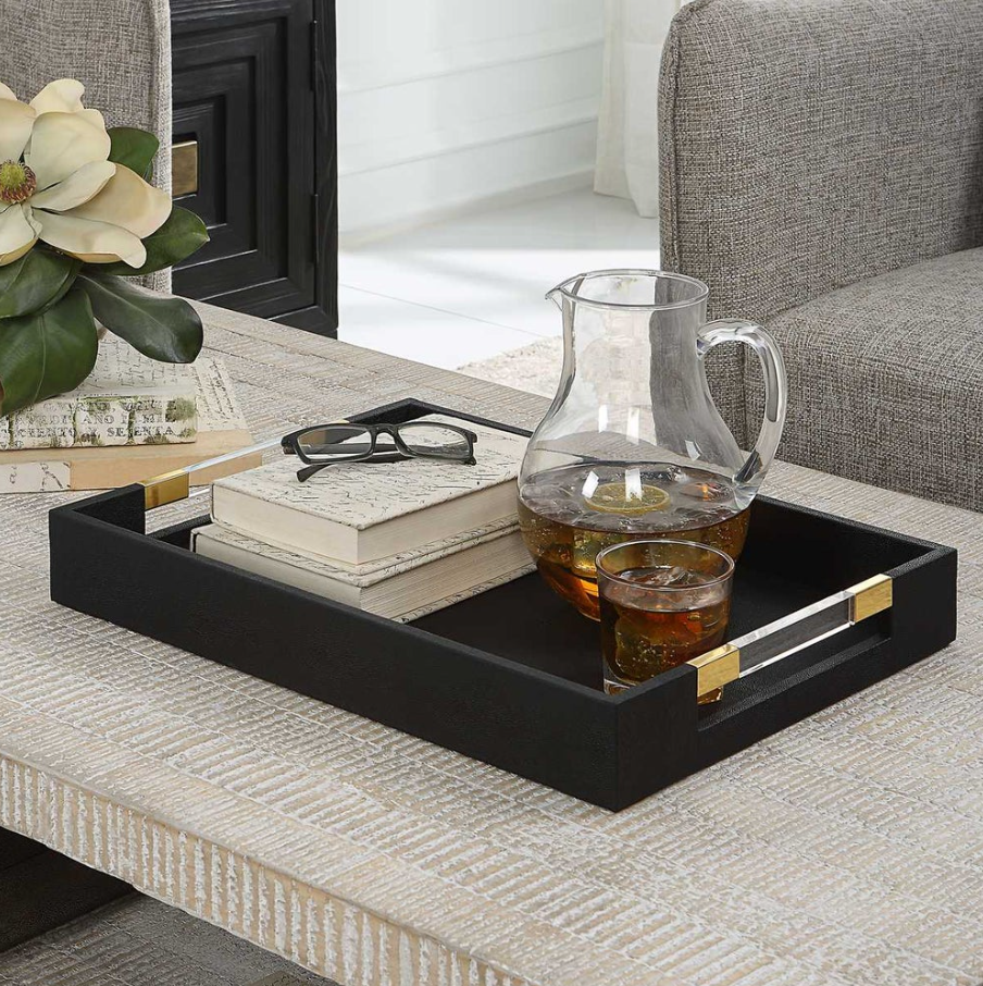 A classic silhouette with modern touches, this tray is covered in a black faux shagreen with sleek acrylic and brass handles.
